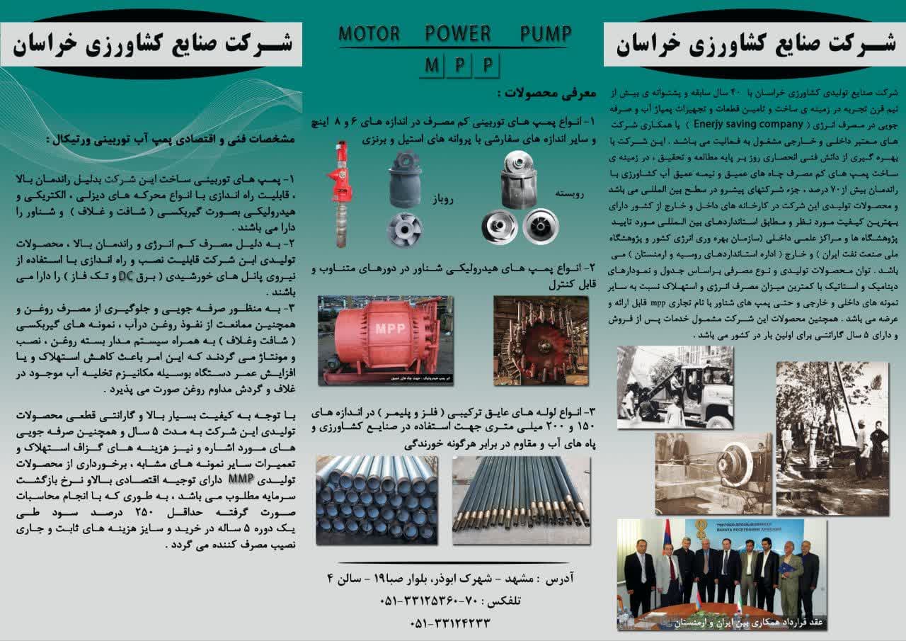 شرکت صنایع تولیدی کشاورزی خراسان با سابقه 35 سال و پشوانه بیش از 50 سال تجربه در زمینه تجهیزات استحصال آب و صرفه جویی انرژی با همکاری شرکتهای معتبر داخلی و خارجی مشغول به فعالیت می باشد. این شرکت با بهره گیری از دانش فنی انحصاری روز و تجهیزات دقیق در زمینه ساخت پمپ های کم مصرف چاههای عمیق باراندمان بیش از 70% از شرکت های پیشرو در سطح بین المللی می باشد و محصولات تولیدی این شرکت در کارخانه هی داخل و خارج از کشور دارای بهترین کیفیت مورد نظر و مطابق با استانداردهای بین المللی مورد تایید پژوهشگاه ها و مراکز علمی داخلی و خارجی می باشد.